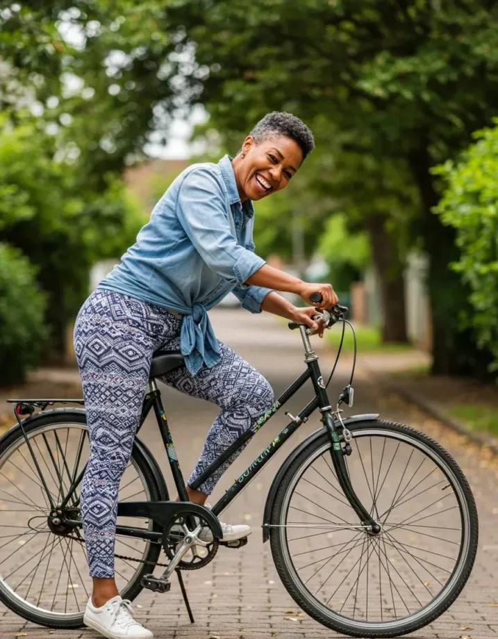 What I love most about this look is how joyful and easy it feels. The printed leggings add personality without being too loud, and the tied denim shirt gives it that little extra charm. It’s such a great reminder that activewear can still be super cute. Whether you’re out for a ride or just grabbing iced coffee after a walk, this outfit totally says I ve got style and I m loving life.”