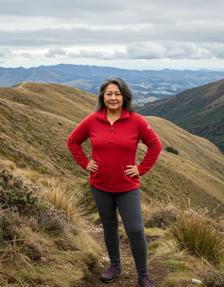 This outfit is perfect for soaking in those mountain views and conquering every trail in sight. She s wearing charcoal grey leggings that are made for movement, paired with a bold red zip-up fleece that adds a fun pop of color to the rugged landscape. Sturdy hiking shoes round out the look, keeping it all grounded, comfy, and ready for adventure.