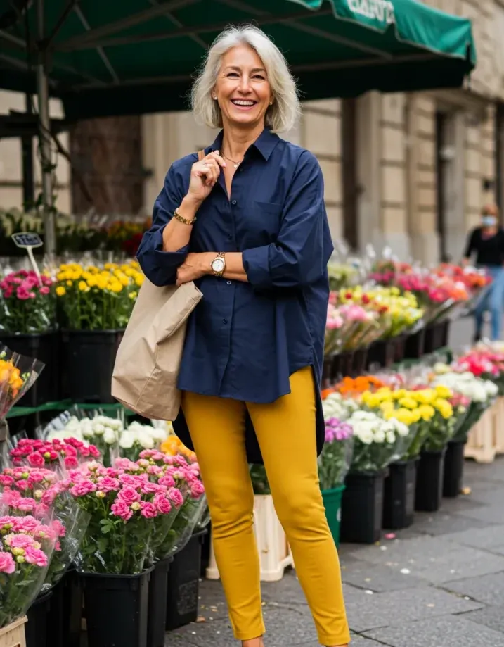 This outfit is all about color confidence and city charm. She s rocking mustard yellow leggings that bring instant joy and pairing them with an oversized navy button-down that balances the look with polish. Add in classic tan loafers and a chic paper bag tote, and you’ve got the perfect outfit for a flower market stroll or a casual lunch downtown.