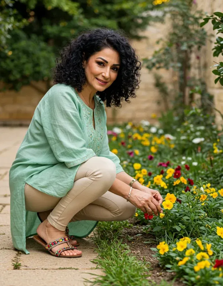 What I absolutely love about this outfit is how light and relaxed it feels. The kurti gives such elegant coverage, and those soft neutral leggings make it comfy for everything from weeding flower beds to just enjoying your morning tea outside. And can we talk about those beaded sandals? So cute and full of charm. It s calm, collected, and garden-goddess approved.