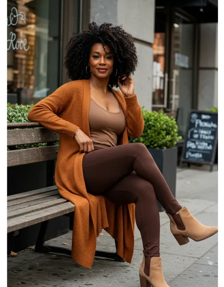 This look is a total autumn dream. The outfit pairs rich chocolate brown leggings with a soft tan tank and layers on a cozy, burnt orange longline cardigan. The textures are buttery and the tones are warm, pulling together that polished yet relaxed street style vibe. The camel suede ankle boots with block heels add just the right pop and make the whole outfit feel complete without trying too hard.