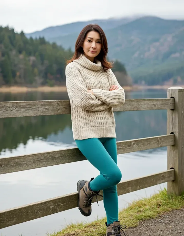 This look is hiking trail meets cozy cabin dream. She’s wearing bright teal leggings that bring a burst of color to the otherwise soft, earthy tones. The chunky oatmeal turtleneck sweater is giving all the comfort vibes, and the sturdy tan hiking boots say she s ready to explore but in style. The peaceful lakeside backdrop just makes the whole outfit even more serene.