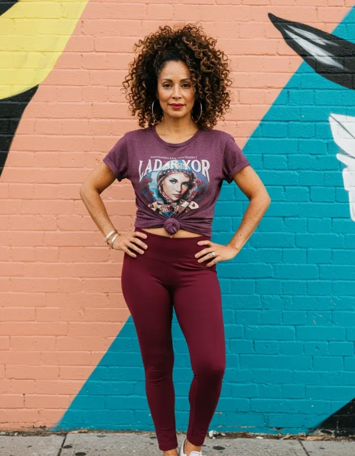 This look is fun, punchy, and full of personality. She s wearing deep burgundy leggings that hug just right and pairs them with a knotted graphic tee in a matching plum tone. The crisp white sneakers keep it cool and casual, perfect for strolling city sidewalks or grabbing lunch with a friend. That bold mural in the background just adds to the whole playful energy.