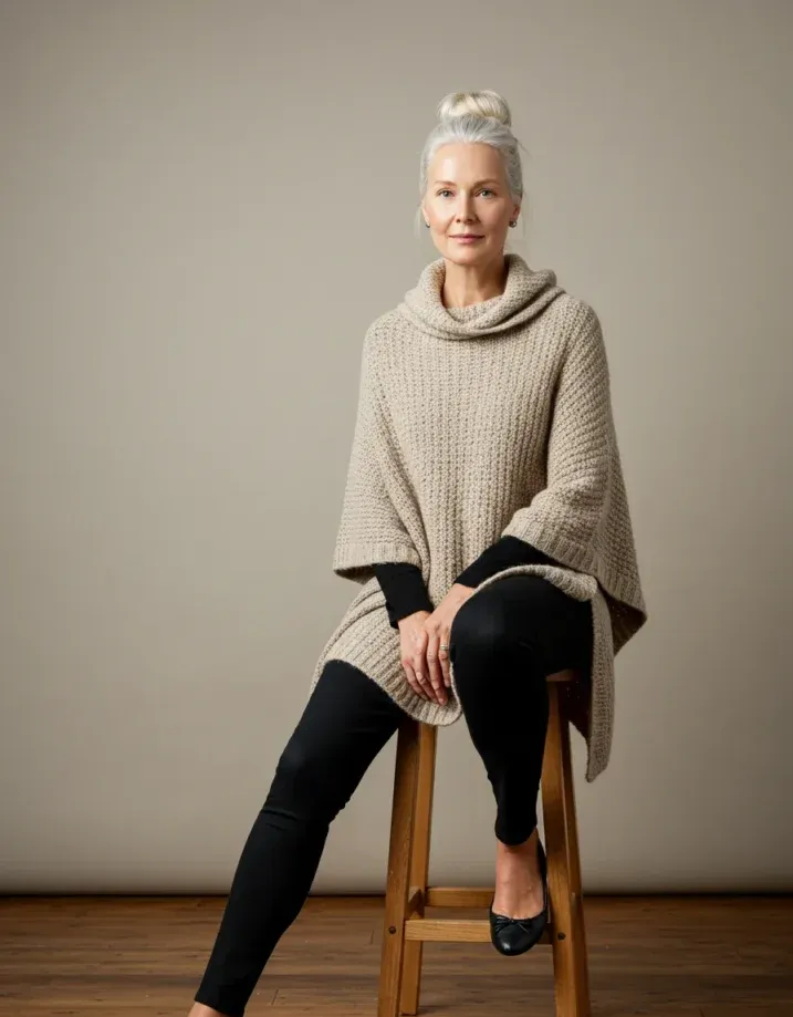 I seriously love how graceful this whole outfit feels. It s the perfect blend of comfort and polish, which is basically my favorite fashion combo ever. The poncho makes a statement without shouting, and the black leggings keep it grounded and flattering. Honestly, I d wear this to brunch, to a cozy bookshop, or even just around the house when I want to feel a little extra fabulous while staying snug.