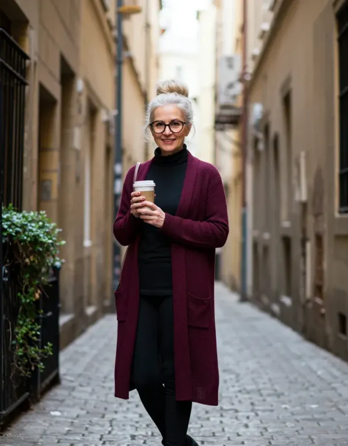This look is cozy café chic with just the right amount of polish. She s wearing classic black leggings and a sleek black turtleneck, then adds a long burgundy cardigan for that rich hit of color. Black ankle boots keep it streamlined and smart, and the round glasses and top bun? Total style bonus. Oh, and the coffee-to-go? That s the ultimate accessory.