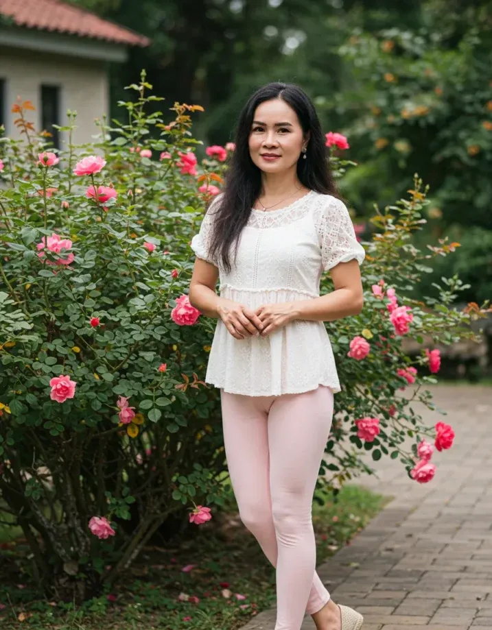This outfit is soft, sweet, and just plain lovely. She s wearing pale blush pink leggings paired with an elegant lace-detailed peplum top in crisp white. The delicate texture of the blouse adds so much femininity, and the woven espadrilles complete the look with a breezy, summery feel. Surrounded by blooming roses, it s giving full-on romantic vibes.