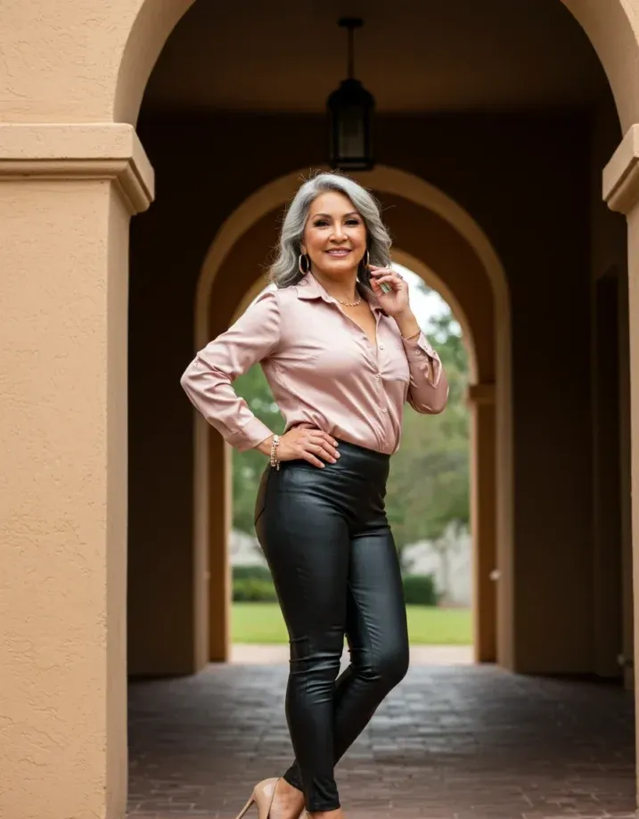 What I love most about this outfit is how confident it feels. It s flirty, it s classy, and it totally says I know who I am and I love it.” The satin blouse adds elegance, while the leather leggings bring all the edge. Perfect for date night, cocktails, or anytime you want to feel fabulous and fearless. This one s a showstopper, for sure.