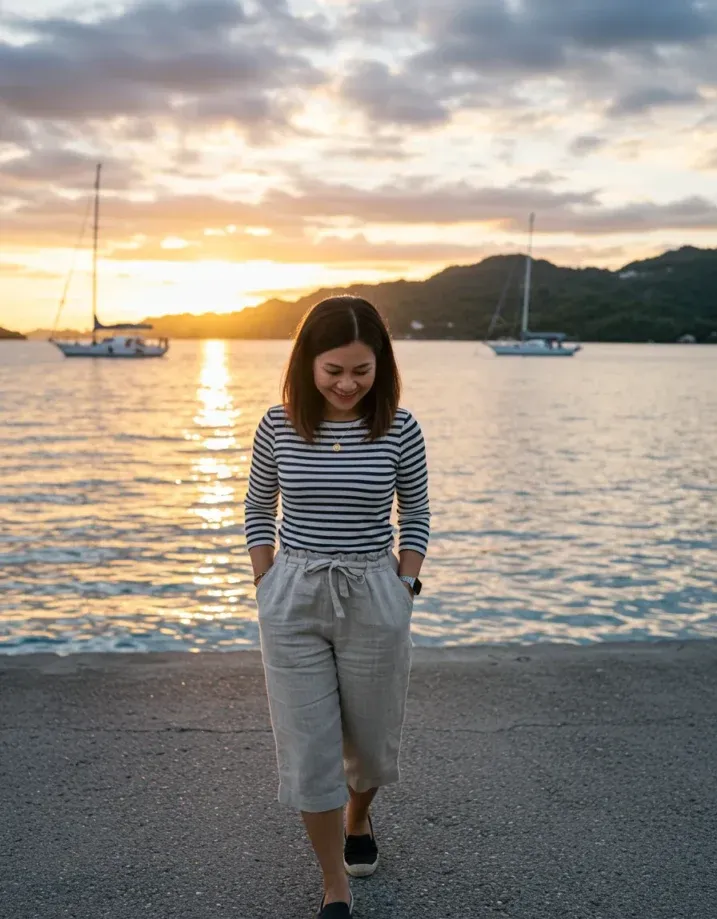 This outfit feels like a breath of fresh seaside air. A fitted navy-and-white striped top pairs effortlessly with light beige linen culottes that tie neatly at the waist. The cropped length keeps the look breezy and shows off black espadrilles that are comfy and casual. A simple gold necklace adds a tiny touch of shine, perfect for catching the sunset glow.