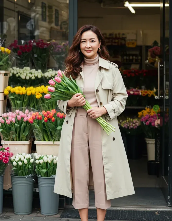 This outfit brings together soft elegance and smart layering. A blush-toned turtleneck and matching cropped trousers form the monochrome base, topped with a timeless beige trench coat that adds polish without being heavy. Black loafers ground the look and give it that slightly preppy charm, while gold hoops and a fresh bunch of tulips add personality and joy.