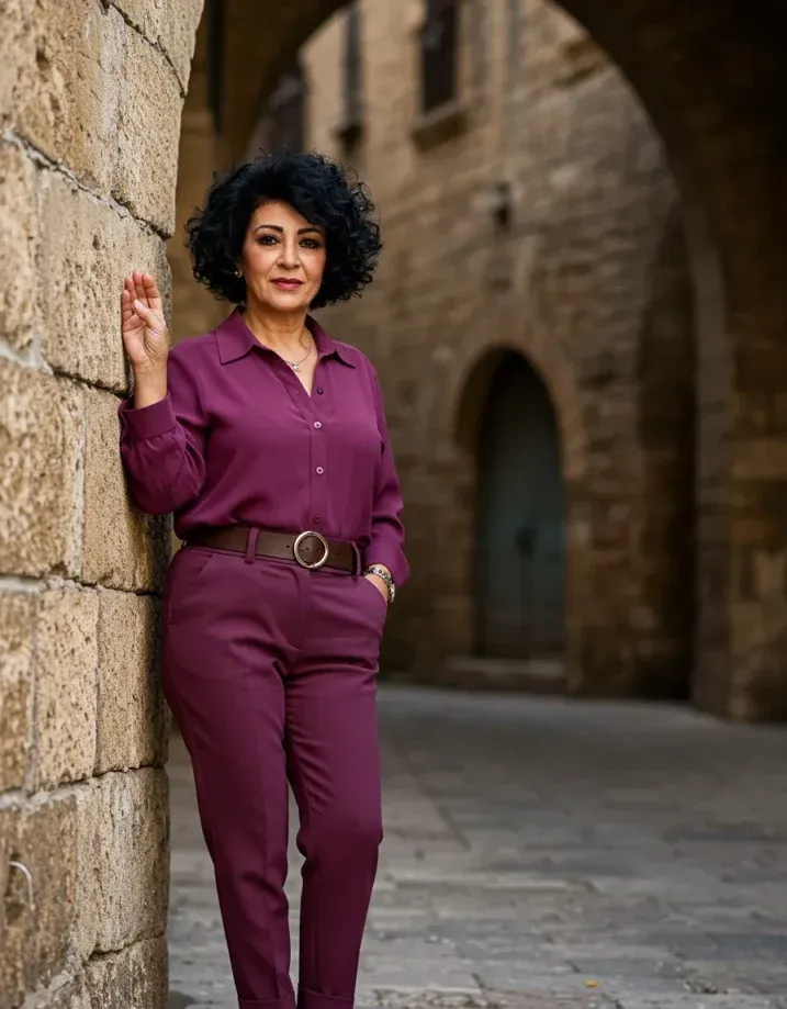 This stunning monochromatic outfit features a rich plum blouse paired with tailored plum trousers, creating a sleek, elongated silhouette. A wide brown belt with a statement buckle adds structure and contrast, while nude heels lengthen the legs and keep the look soft. The minimal jewelry and rolled cuffs give it a relaxed elegance that feels confident without trying too hard.