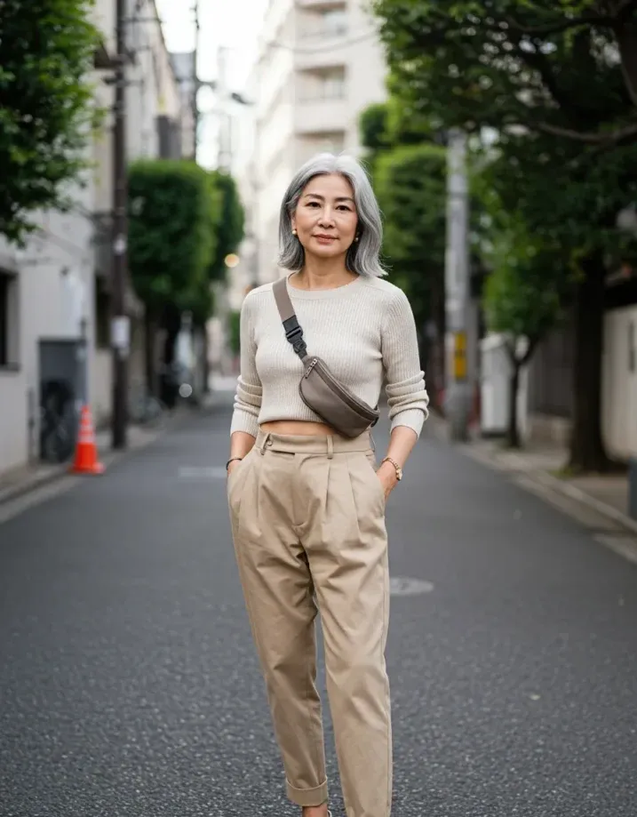 This effortlessly cool outfit features a ribbed, cropped sweater in a soft beige tone paired with high-waisted pleated trousers that taper just above the ankles. White loafers add a crisp, modern touch, while a crossbody belt bag slung across the chest brings a sporty, city-chic vibe to the look. Rolled cuffs and minimal accessories keep it sleek and unfussy.