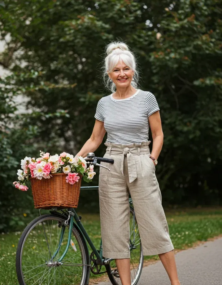 This effortlessly cute outfit features a classic black-and-white striped tee tucked into high-waisted, wide-leg linen culottes in a natural beige tone. The tie waist adds a touch of structure, while the cropped length keeps the look light and playful. Woven slip-on sneakers finish it off with comfort and ease, making it perfect for a sunny day out and about especially with a basket full of blooms on your bike.