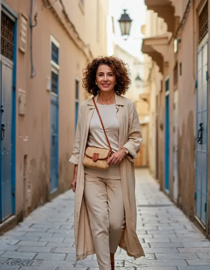 I absolutely adore how fresh and airy this outfit feels. The long duster adds a little drama (the good kind!) without overwhelming a petite frame, especially when the layers underneath are all in the same tone. It s such an easy outfit to throw on and instantly feel pulled together. I d wear this for a relaxed city stroll, market shopping, or even sightseeing on vacation it s the definition of effortless chic.