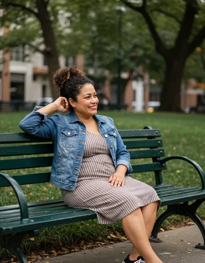 This laid-back outfit pairs a ribbed knit midi dress in a neutral taupe with a classic cropped denim jacket. The textures play beautifully together soft and stretchy meets sturdy and structured. The dress hugs just right without being clingy, and the jacket adds a bit of shape and cool-girl charm. Black canvas sneakers give it a youthful, sporty twist that s perfect for weekend wanderings.