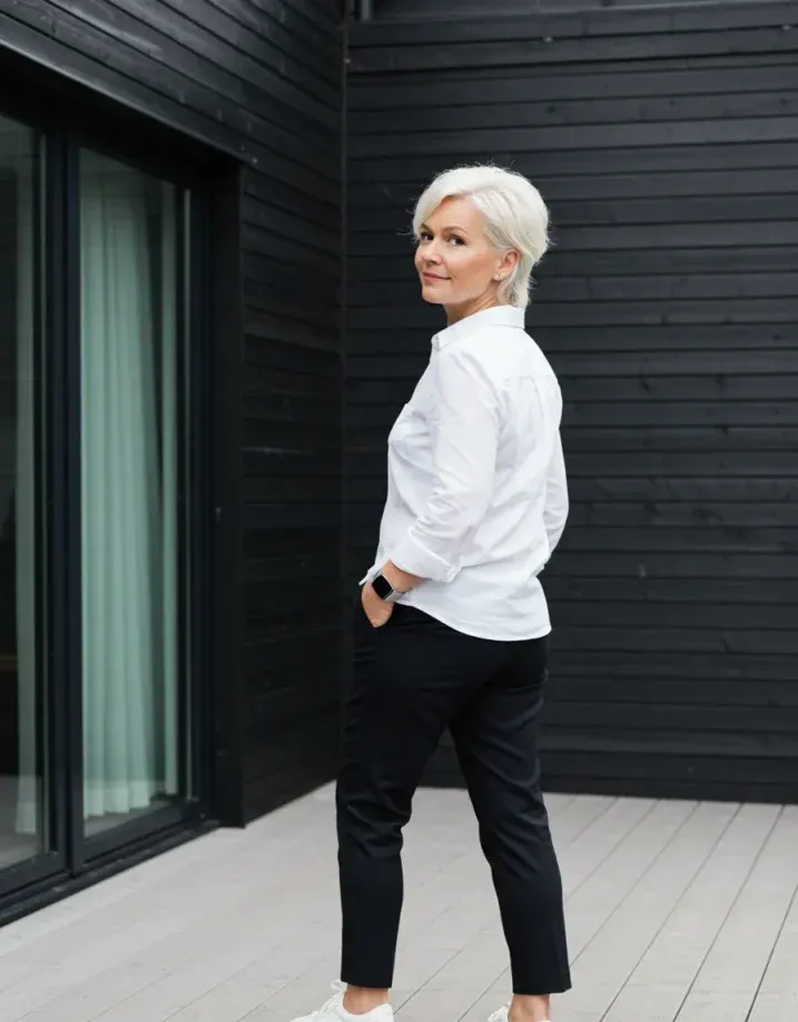 This outfit keeps things clean and classic with a crisp white button-down shirt, slim black ankle pants, and bright white sneakers. The shirt is slightly relaxed for comfort, and the pants hit just above the ankle, showing off the shoes in the best way. There s no fuss, no frills just a sleek, polished look that feels modern and easy to wear. And that smart watch? A little sporty edge that totally works.
