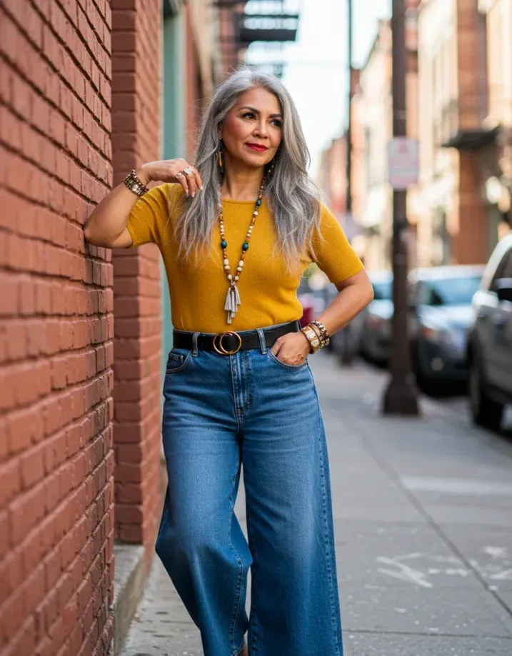 This outfit is all about making a statement without going over the top. The rich mustard knit top adds instant warmth and glow, especially against silver hair, while the high-waisted wide-leg jeans balance everything out beautifully. A chunky belt cinches the waist and defines the silhouette, and those layered wooden and gold-toned accessories bring in a playful boho vibe. The brown sandals are the perfect finishing touch stylish but comfy enough for city strolls.