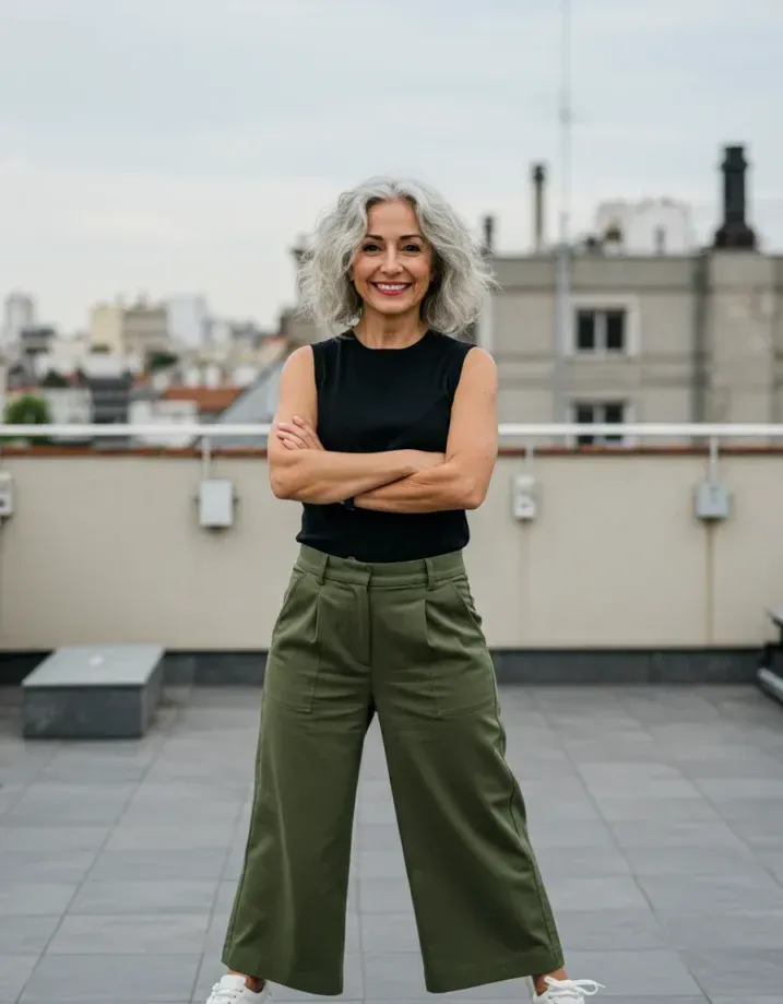 This modern, no-fuss outfit pairs a fitted black sleeveless top with olive green wide-leg cropped trousers that feature sharp pleats and roomy patch pockets. Chunky white platform sneakers add a playful, sporty vibe and help elongate the silhouette especially great for petites who want a little lift without sacrificing comfort.