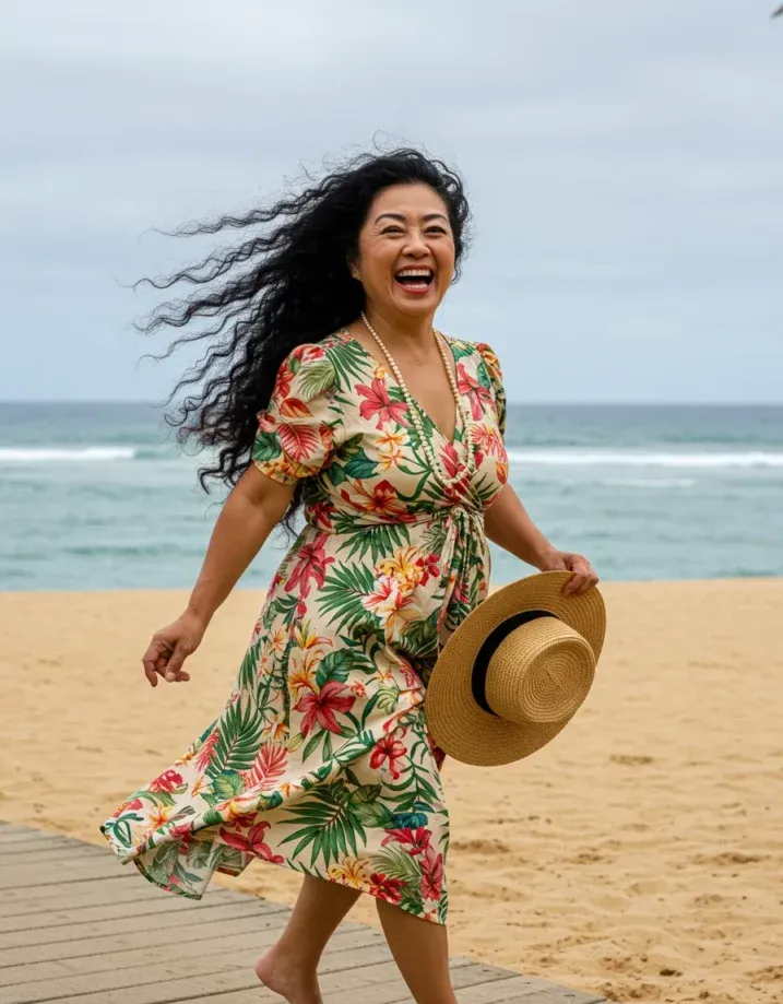 This joyful beachside look features a vibrant off-the-shoulder midi dress covered in lush tropical florals. The soft fabric flows with the breeze, while the smocked neckline keeps things comfortable and secure. A classic straw hat in hand and pearls around her neck bring the island vibes full circle. No shoes, no problem barefoot is the best accessory here.