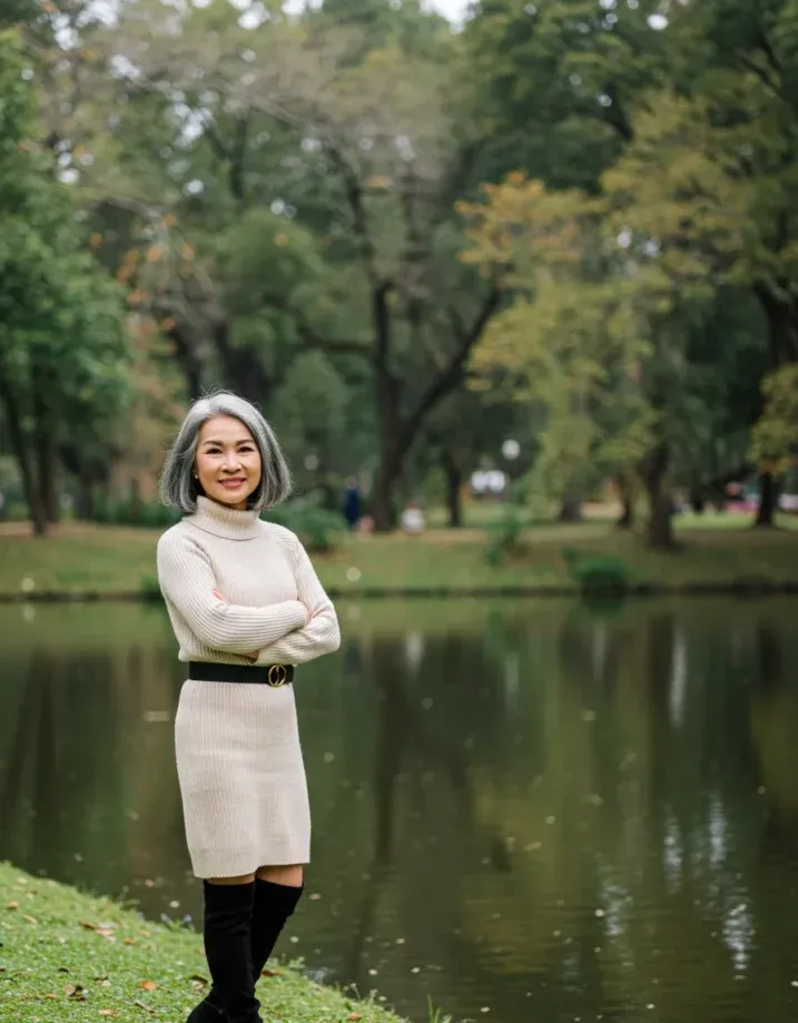 What I love about this look is how snug and stylish it feels all at once. Sweater dresses are magic for petites they hug you just right without feeling bulky. And those over-the-knee boots? Yes please. They visually lengthen the legs and bring a little drama (the good kind). This outfit would be my go-to for a chilly afternoon walk in the park, a casual dinner, or any moment I want to look polished but feel like I’m wrapped in a soft blanket.