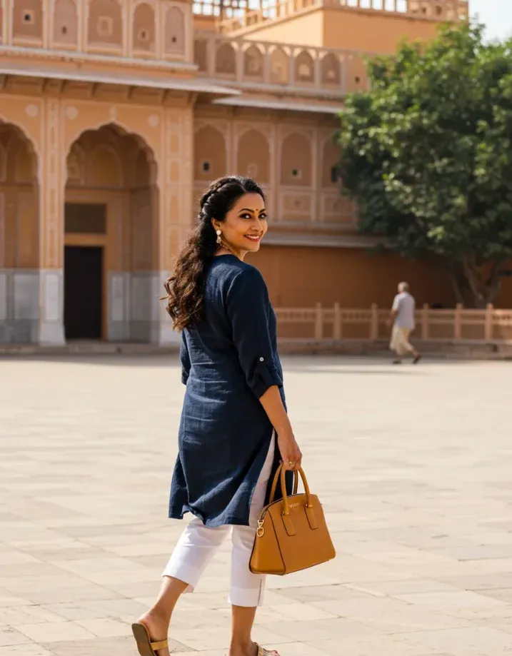 This look features a beautifully structured navy tunic with rolled-up sleeves and side slits, paired effortlessly with slim white ankle-length pants. The rich indigo hue adds a touch of sophistication, while the bright white bottoms keep things light and fresh. Gold sandals bring in a little sparkle, and the tan leather handbag adds warmth without stealing the show. The soft curls, statement earrings, and that confident smile? Totally sealing the deal.