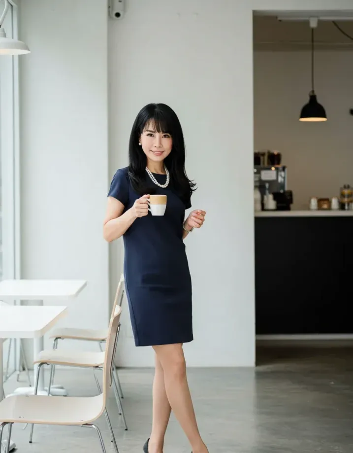 This timeless outfit features a sleek navy sheath dress that fits like a dream, falling just above the knee for a polished silhouette. It s paired with simple black pumps and a strand of pearls, giving it that touch of grace and elegance that never goes out of style. The look is finished with delicate pearl studs and subtle makeup effortless and sophisticated from every angle.