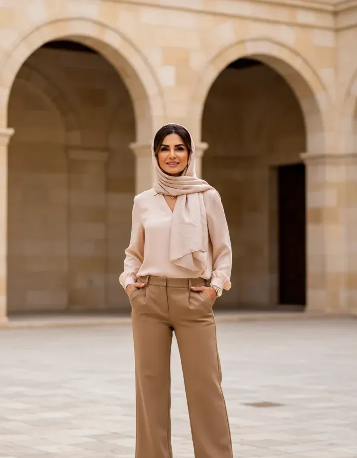 This look features a soft blush blouse tucked neatly into high-waisted tan trousers with a flattering wide-leg cut. The matching blush scarf adds an airy, graceful layer, while nude heels tie it all together for a streamlined, elongated effect. The entire outfit flows in shades of beige and blush, creating a calm and classy color story that s as flattering as it is polished.