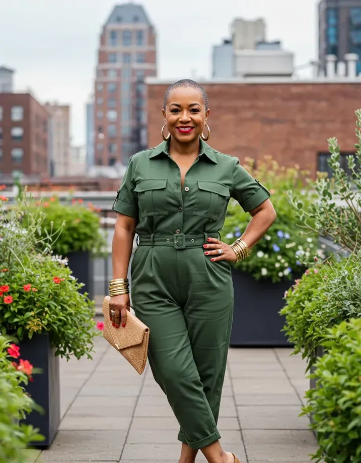 This outfit is built around a fabulous olive green jumpsuit with a belted waist and tailored structure that hugs in all the right places. The rolled-up pant legs and chest pockets give it that trendy utility look, while tan block-heeled sandals and a woven clutch add softness and contrast. The gold bangles and hoops are bold and fun, and her bright lipstick pulls everything together with a confident pop.