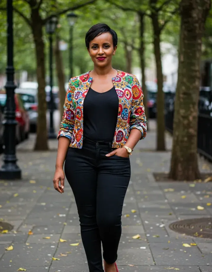 This outfit makes the most of contrast by pairing a bold, vibrant jacket with a simple black tank and fitted black jeans. The jacket is bursting with playful prints and color, creating an eye-catching centerpiece. A pair of red loafers echo the jacket’s tones while adding a splash of fun on the feet. It s all pulled together with a gold watch and a confident smile that totally seals the look.