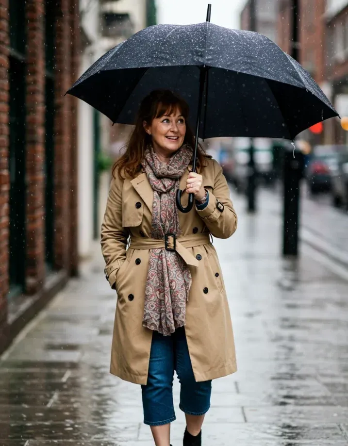 This charming rainy day outfit features a classic beige trench coat cinched at the waist for shape, paired with cropped blue jeans that hit just right above the ankle. A paisley scarf adds both warmth and pattern, while black ankle boots keep feet dry and stylish. The whole look is topped off with a big black umbrella and an even bigger smile because who says rainy days can t be cute?