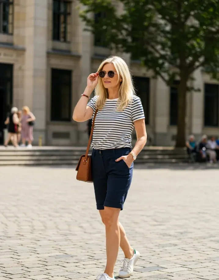 Here s proof that the basics never go out of style. She s wearing a fitted navy and white striped tee tucked neatly into a pair of knee-length navy shorts that look structured yet comfy. The look is finished with fresh white sneakers, a warm brown crossbody bag, and round sunglasses that add just the right touch of retro flair. It s crisp, clean, and totally city-stroll ready.