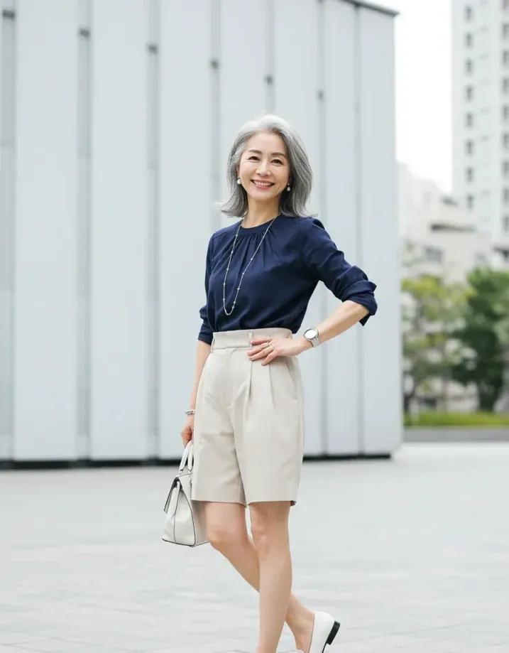 This outfit is such a masterclass in polished simplicity. She s wearing a navy blouse with gentle pleating around the neckline, paired with high-waisted cream shorts that give just the right structure. The shorts are tailored with soft pleats and a modest length that feels modern yet age-appropriate. White loafers, a structured handbag, and delicate silver accessories round out the look with a clean, fresh vibe.