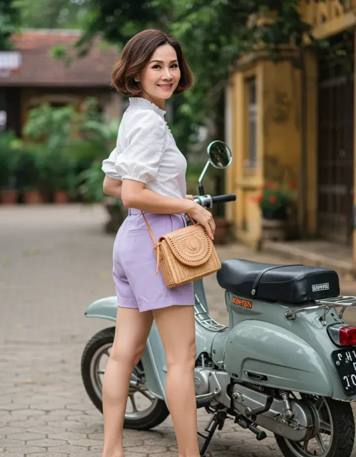 This outfit is sweet, polished, and full of charm. She s wearing a crisp white blouse with darling puff sleeves and subtle ruffle detail around the neckline. The top is tucked into soft lavender high-waisted shorts that feel both refined and feminine. She finishes the look with nude ballet flats and the cutest little woven crossbody bag that ties it all together with texture and warmth.