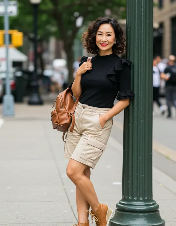 This outfit is the perfect mix of practical and polished. She s styled a black top with subtle ruffle details at the shoulders and sleeves just the right touch of feminine flair. It s paired with beige cargo shorts that bring a casual, utilitarian vibe, made instantly chic with lace-up tan wedge boots. Her brown leather backpack adds a stylish, hands-free finish.