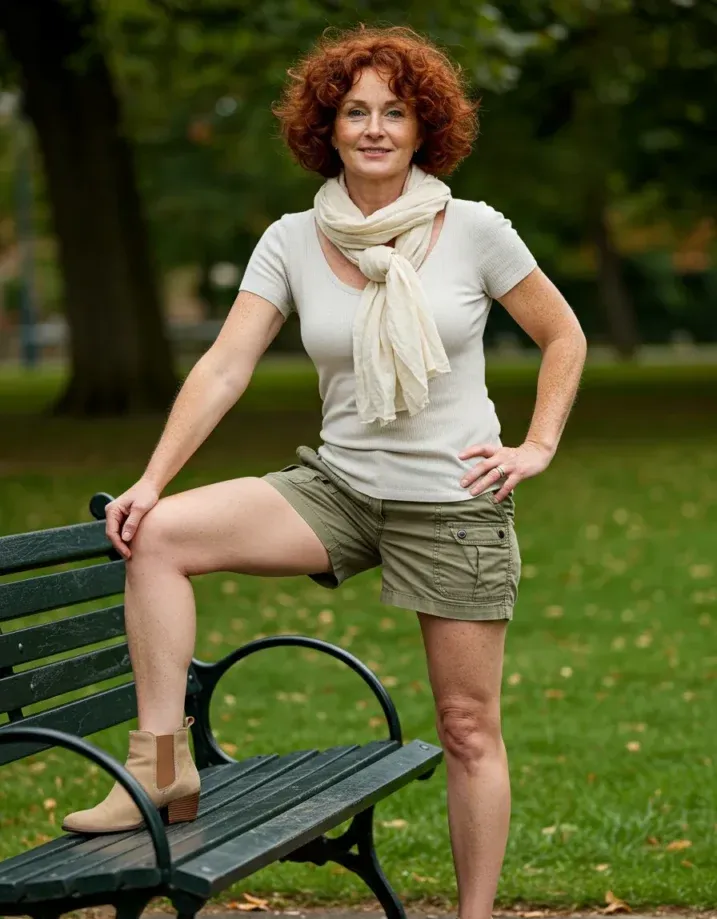 This look is equal parts cozy and confident. She s wearing a fitted beige ribbed tee that hugs just right without feeling too tight. It s paired with olive green cargo shorts that have cute button pockets and a relaxed vibe. The cream scarf adds a touch of softness and a little flair, while those tan ankle boots give the whole outfit a bit of structure and sass.