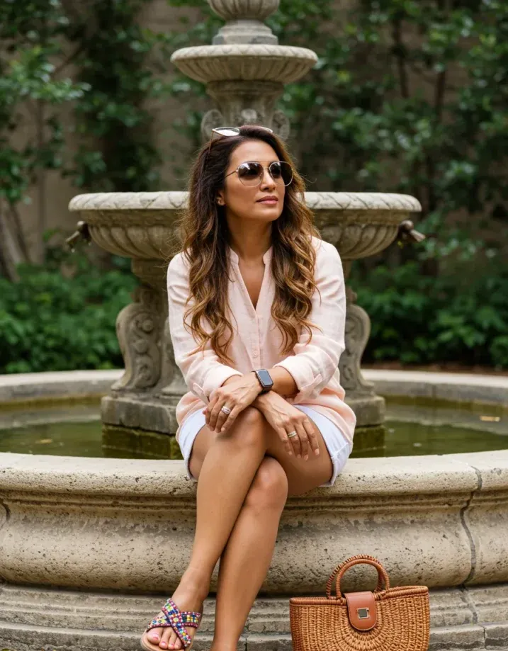This outfit is like a breath of fresh air on a warm afternoon. She s wearing a light blush pink button-up with a relaxed, slightly oversized fit that looks so easy to wear. It s paired with crisp white shorts that keep things clean and summery. The look is accessorized with oversized sunnies, colorful beaded sandals that add a playful pop, and the cutest structured woven bag that gives serious vacation vibes.