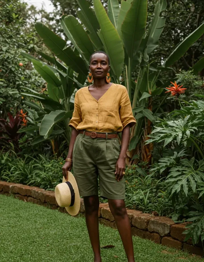 This outfit is giving breezy and bold in the best way. She s rocking a mustard linen blouse with a relaxed fit that feels effortlessly chic. The blouse is tucked into a pair of high-waisted olive green shorts that hit just above the knee, cinched perfectly with a brown leather belt. Matching tan slides, statement wooden earrings, and a classic straw hat tie the look together in a way that screams laid-back glam. The lush tropical garden setting just makes it even dreamier.