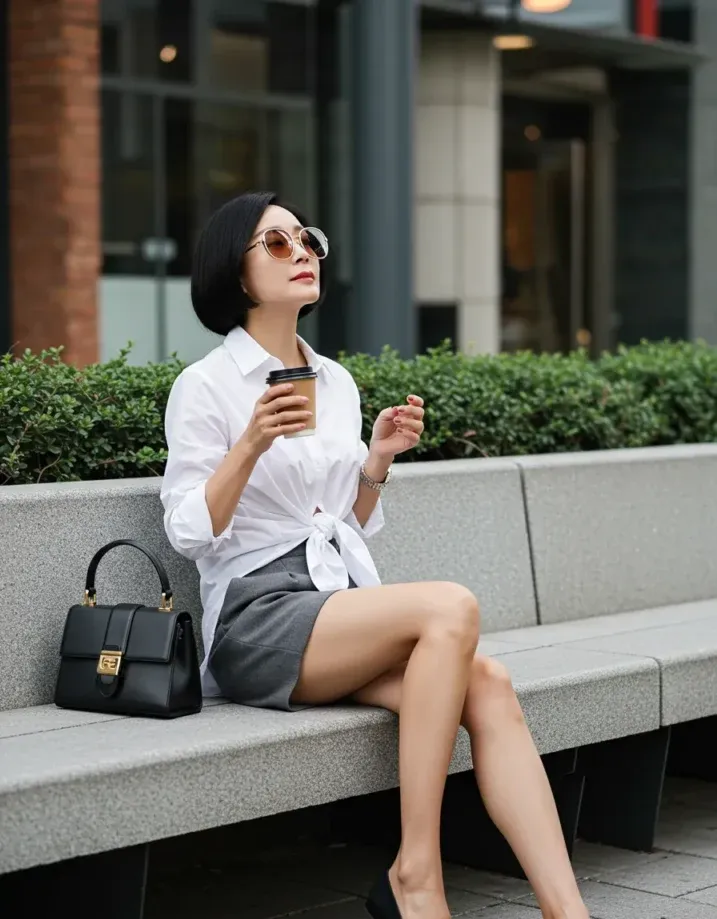 This outfit is straight-up city chic. She s wearing a classic white button-down shirt with the front tied in a cute little knot, adding just the right hint of playfulness. It s paired with sleek tailored gray shorts that sit perfectly at the waist, giving that polished but relaxed feel. Black ballet flats, a structured handbag, and oversized sunnies round it out with total style points.