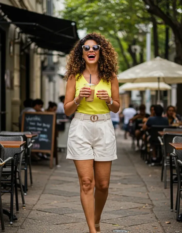 This outfit is pure sunshine with a side of iced coffee. She s wearing a bright yellow sleeveless top that brings instant energy to the look, tucked into a pair of high-waisted white shorts with a chic belted waist and cuffed hems. Nude platform sandals give her that little lift, and her bold curly hair, oversized sunnies, and glowing smile make everything pop.