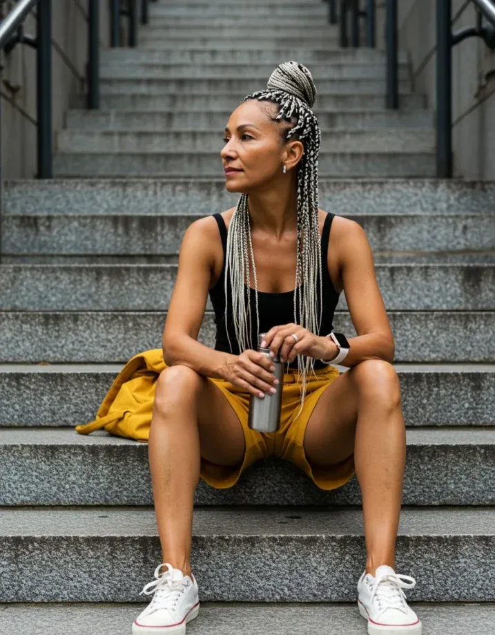 This outfit is all about confidence and ease. She s rocking mustard yellow athletic-style shorts that add a burst of color, paired with a sleek black tank that keeps it clean and bold. White sneakers keep things practical and fresh, while the matching mustard jacket casually tossed behind her says she s always prepared. That high braided bun? Pure attitude and style.