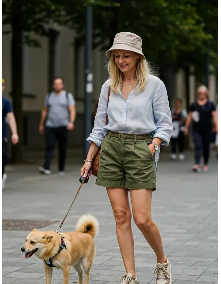 This outfit is peak casual-cute and absolutely dog-walk approved. She s wearing olive green utility shorts with a belted waist and comfy length, paired with a light blue linen button-up shirt that s slightly tucked in for that easygoing polish. Neutral-toned sneakers, a soft bucket hat, and a simple brown crossbody bag tie the whole look together without breaking a sweat.