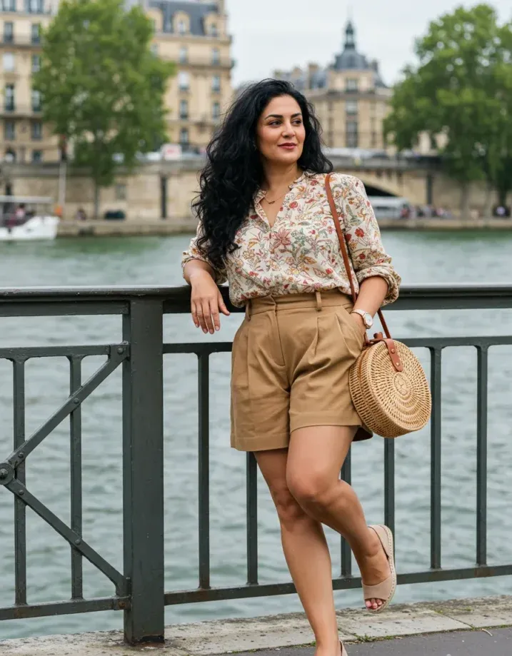 This outfit feels like a warm breeze along the Seine. She s wearing a soft floral blouse tucked into tailored tan shorts that sit just right at the waist with gentle pleats. The neutral palette keeps it elegant while the woven round bag adds a sweet dash of texture. Simple beige peep-toe flats keep it comfy but stylish, and the whole vibe is very effortless, but make it fashionable.â