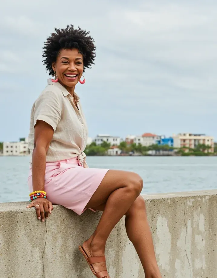 This outfit is sweet, sunny, and totally mood-lifting. She s styled a beige linen button-up shirt with the front tied in a cute knot for an easygoing touch. The shirt is paired with soft pink shorts that bring just the right pop of color, and she finishes the look with warm brown flat sandals. Colorful bead bracelets and playful pink hoop earrings add extra joy and personality to the mix.