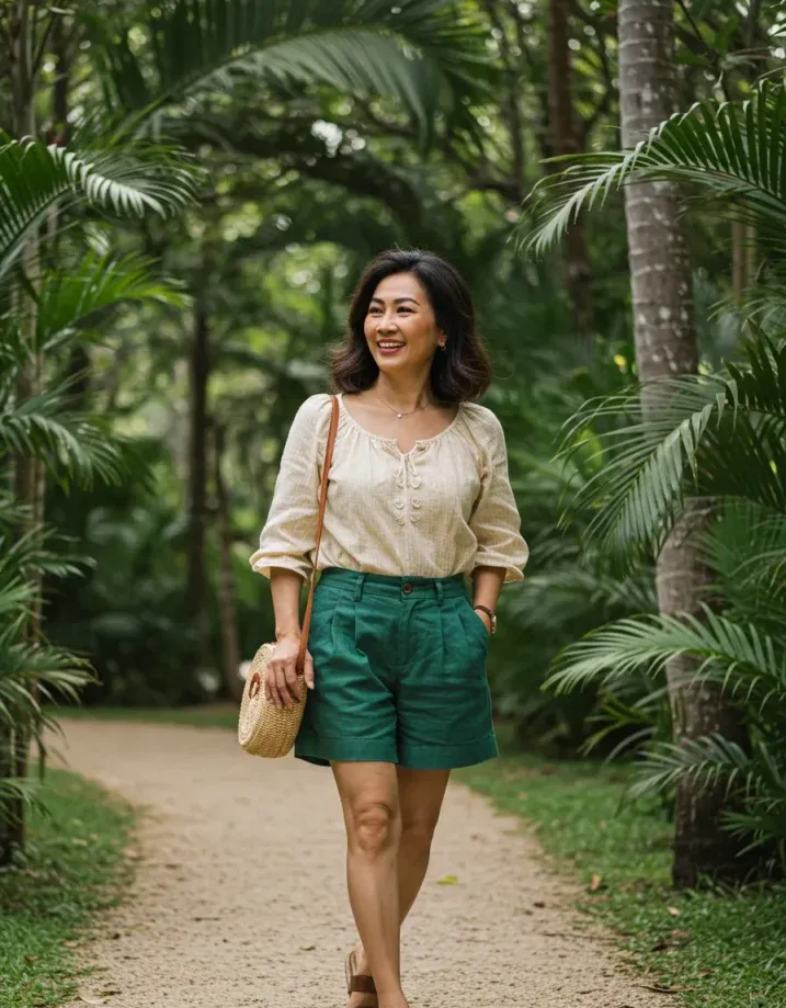 This look is giving quiet luxury in the middle of a tropical escape. She s wearing a soft, peasant-style blouse in a light oatmeal shade with subtle detailing at the neckline. It s tucked into high-waisted forest green shorts that feel structured yet breezy. Brown strappy sandals and a small round straw bag keep the look grounded in earth tones, while her natural makeup and soft waves add to the easygoing vibe.
