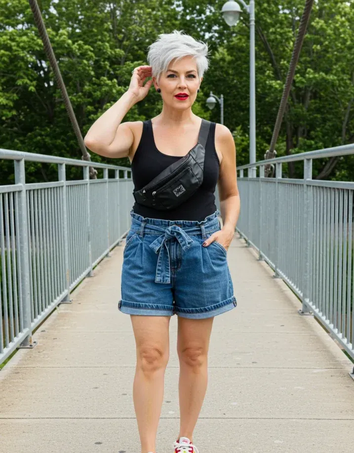 This outfit is pure spunk and confidence. She s rocking high-waisted denim paperbag shorts with a tie belt and cuffed hems that feel super fresh. The black tank is sleek and simple, letting that cool crossbody belt bag do the talking. And let s not skip those bright red sneakers they bring a whole punch of personality. Her silver pixie cut and bold red lip? Total power move.