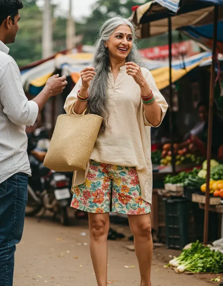 This outfit just radiates joy. She s rocking a pair of vibrant floral shorts in bold shades of orange, red, and teal that instantly brighten up the day. The loose, natural-toned tunic top brings the perfect contrast light, flowy, and effortlessly chic. Brown strappy sandals keep things grounded, and the big woven tote just screams farmers market fabulous. Bangles and a big smile? Absolute bonus.