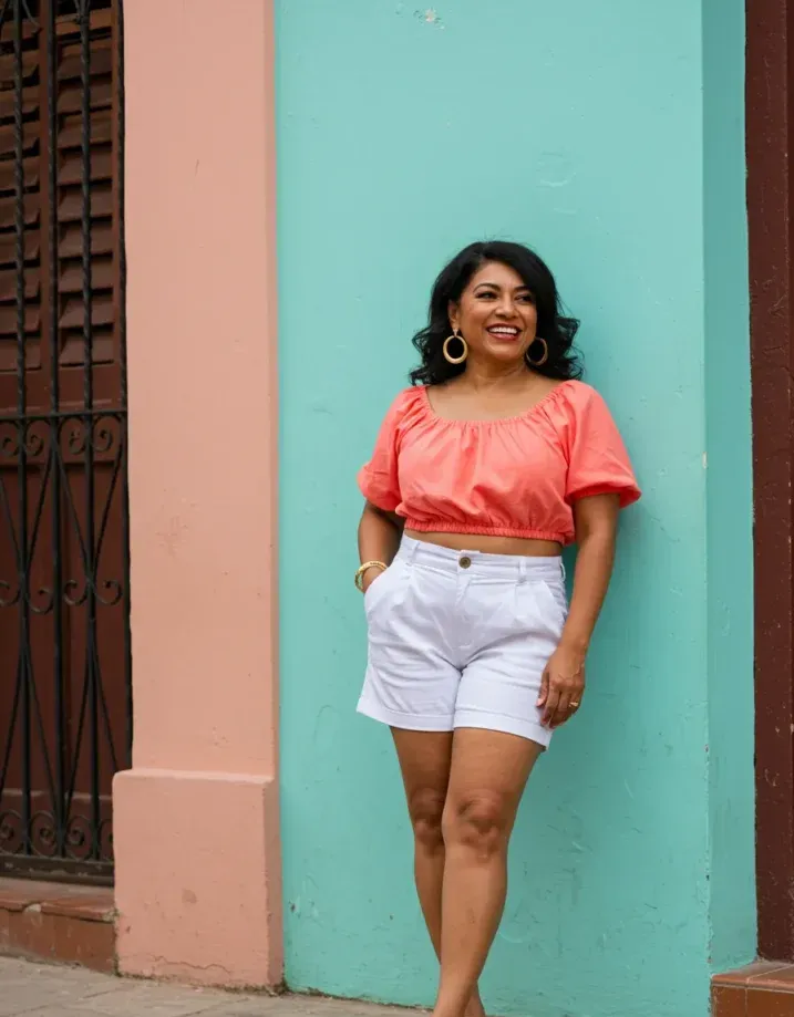 This outfit is giving sunshine and smiles all day long. She s wearing a coral crop top with gathered details and a relaxed neckline that keeps things flirty but comfortable. It s paired with crisp high-waisted white shorts that balance everything out and flatter beautifully. Neutral sandals and bold gold hoops complete the look with just the right touch of glam.