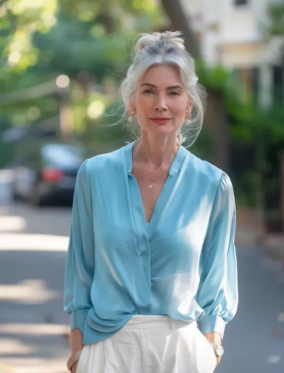 A breezy light blue blouse is tucked effortlessly into ivory trousers in this easygoing yet refined outfit. The blouse has a subtle shine that catches the light just right, and the soft structure of the pants gives it that relaxed elegance we all love.