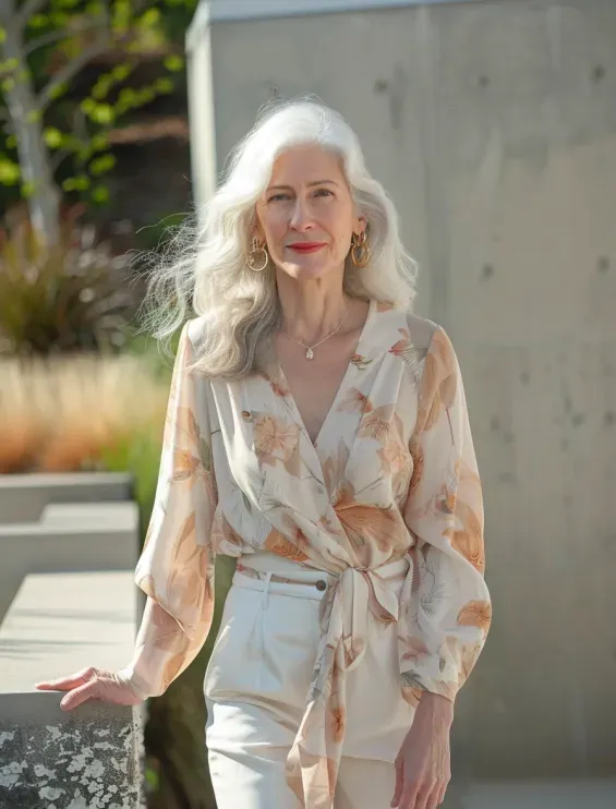 This look features a dreamy wrap blouse with sheer sleeves and a delicate floral pattern in earthy peach tones. It s paired with fitted ivory trousers that keep the silhouette sleek. The soft draping of the blouse and the tie at the waist make this look both flattering and easygoing.