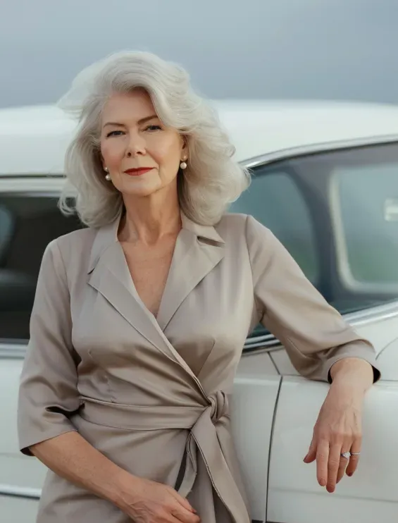 This outfit features a silky taupe wrap dress with three-quarter sleeves and a sharp collar. The waist tie gives just enough definition without feeling tight, and the understated color keeps it classic and versatile. Paired with pearl earrings and softly styled hair, it feels refined without trying too hard.