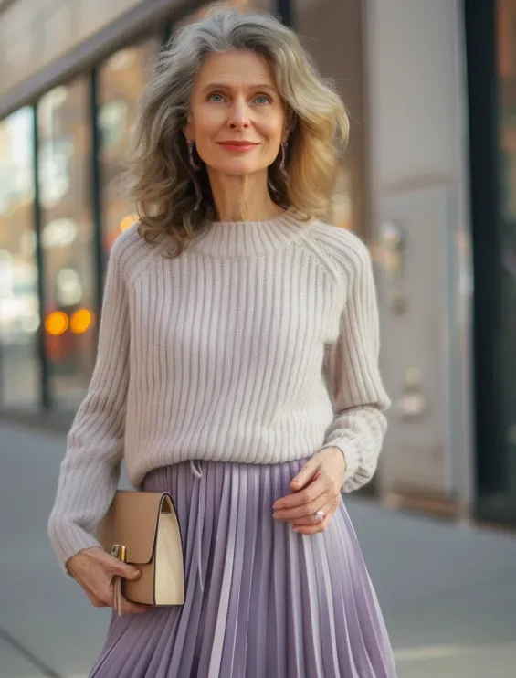 Here we have a cozy ribbed knit sweater in a soft beige shade, tucked into a flowy pleated skirt in the prettiest lavender tone. The contrast between the structured knit and the feminine swish of the skirt keeps the look interesting. A beige clutch and drop earrings finish off the ensemble with a classic touch.